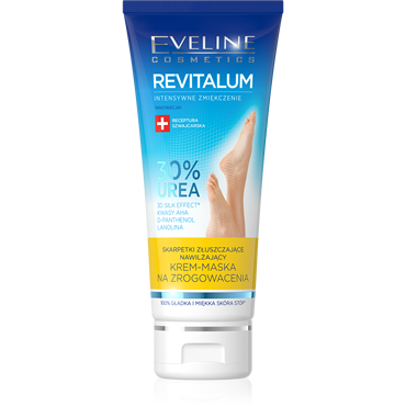 Eveline Revitalum 30% Urea Cream-Mask serves as a powerful dual-action solution for combatting calluses and skin roughness. Enriched with a robust blend of AHA acids, 30% UREA, and lanolin, this cream-mask functions to exfoliate, moisturize, and renew the skin's surface akin to exfoliating socks. Ideal for addressing dry, thickened skin, it contributes to a noticeably smoother, softer texture.