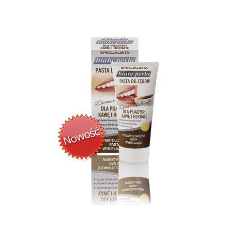 - Biała Perła PASTA DLA PIJĄCYCH KAWĘ I HERBATĘ wybiela zęby poprzez specjalnie opracowany skład zawierający enzym. Pasta jest wzbogacona o ekstrakt z cytryny, który wzmacnia działanie wybielające usuwając przebarwienia organiczne ze szkliwa. Dotyczy to skutków spożywania barwiących produktów, w tym szczególnie kawy i herbaty, ale również – ciemnych soków i warzyw czy czerwonego wina. Dzięki łagodnemu działaniu na szkliwo, pasta przeznaczona jest do długotrwałego i codziennego stosowania. Regularnie stosowana zapewnia niezbędną higienę zębów i jamy ustnej, wspomaga remineralizację szkliwa oraz działanie bakteriostatyczne.