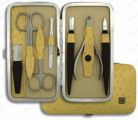 Najwyższej jakości ekskluzywna seria kompletów do manicure. Imitacja skóry strusia sprawia, że jest on elegancki, a zarazem praktyczny. Wysoka jakość akcesoriów powoduje, że zachowują swoje właściwości prze długi okres użytkowania. Komplet zawiera wszystkie elementy niezbędne do pielęgnacji paznokci: popychacz oraz podważacz do skórek, cążki do skórek, nożyczki do paznokci, nożyczki do skórek, dwustronny pilnik w etui oraz ukośną pęsetę. Rączki powleczone zostały specjalną gumą, co gwarantuje pewniejsze trzymanie. Dzięki tym narzędziom, dłonie będą zawsze wyglądać świeżo i olśniewająco. Wymiary: 15,2 x 8,3